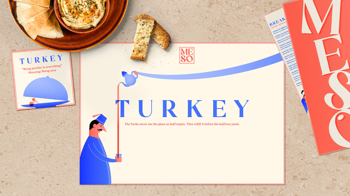 A brand and illustration system for an airport-based Mediterranean restaurant, designed to engage solo travelers during long layovers. Story-driven visuals and characterful illustrations turn dining into a cultural journey across the region.